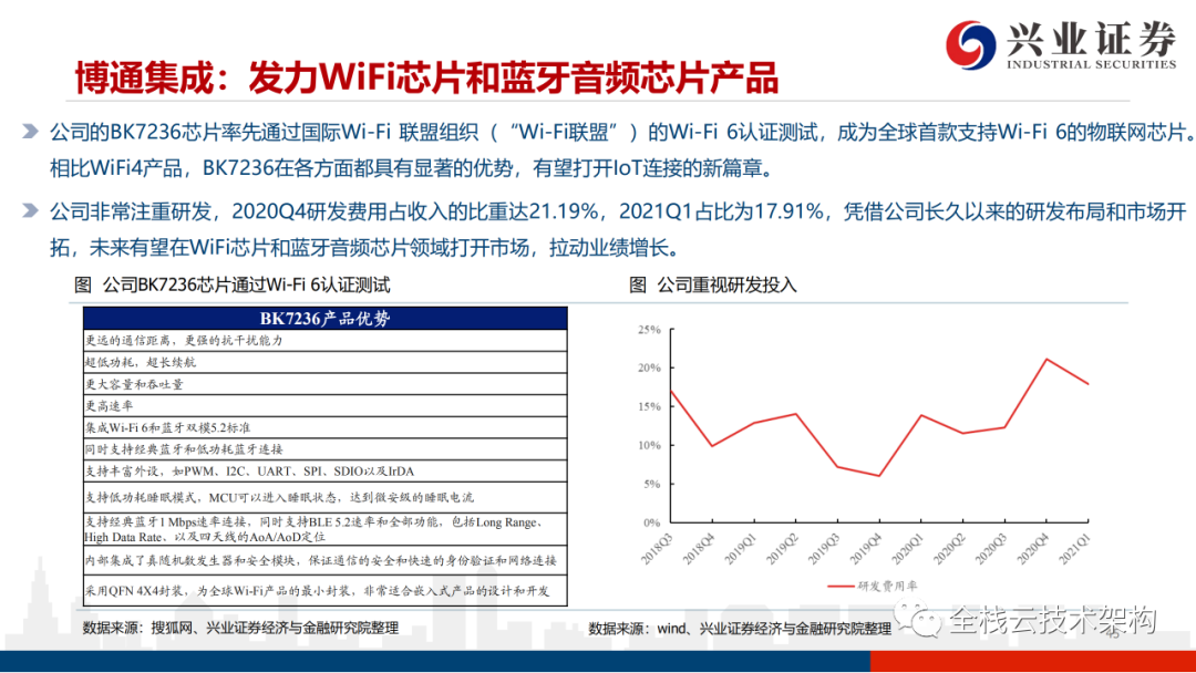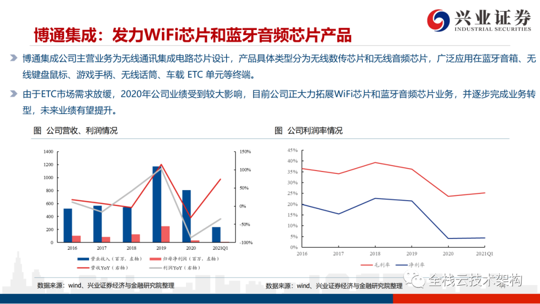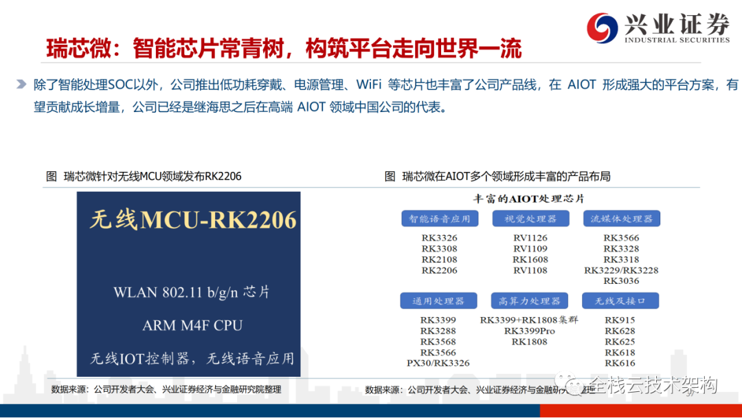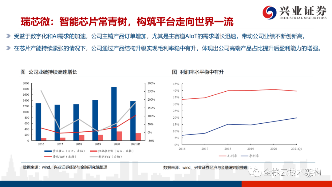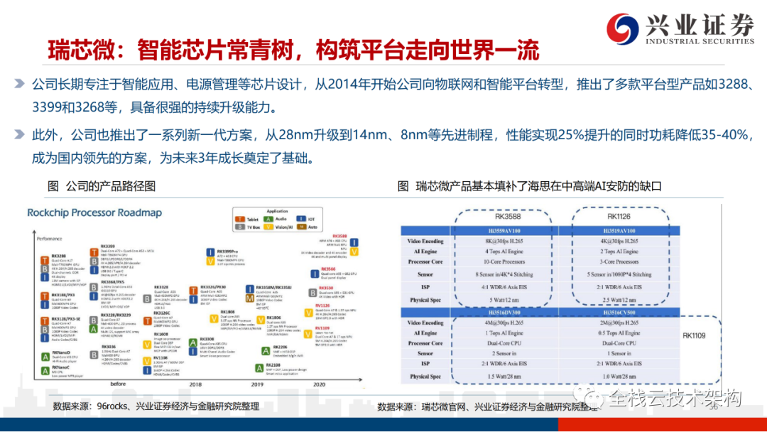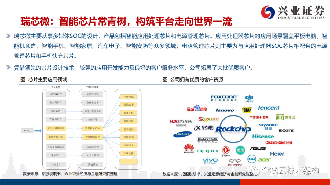 瑞芯微主要从事多媒体SOC的设计,产品包括智能应用处理芯片和电源管理芯片。应用处理器芯片的应用场景覆盖平板电脑、智 能机顶盒、智能手机、智能家居、汽车电子、智能安防等众多领域;电源管理芯片则主要为与应用处理器SOC芯片相配套的电源 管理芯片和手机快充芯片。凭借领先的芯片设计技术、较强的应用开发能力及良好的客户服务水平,公司拓展了大批优质客户。公司长期专注于智能应用、电源管理等芯片设计,从2014年开始公司向物联网和智能平台转型,推出了多款平台型产品如3288、 3399和3268等,具备很强的持续升级能力。此外,公司也推出了一系列新一代方案,从28nm升级到14nm、8nm等先进制程,性能实现25%提升的同时功耗降低35-40%, 成为国内领先的方案,为未来3年成长奠定了基础。恒玄科技主营业务为智能音频 SoC 芯片的研发、设计与销售,芯片目前主要应用于耳机及智能音箱等低功耗智能音频终端,在智 能音频SoC芯片行业处于领先地位。受益于疫情后的需求反弹,公司2020年和2021Q1的业绩均十分亮眼,2021Q1营收YoY达124.55%,归母净利润YoY达4751.05%公司的智能音频SOC芯片在各终端品牌运用广泛,例如2020年推出的BES2500芯片,支持蓝牙V5.2,内置MCU主频高达300MHz, 未来能够支持 LE Audio-LC3 技术,可在相同速率下提供更高的声音质量,已经在荣耀、华为、OPPO等品牌中陆续出货。目前,公司的产品应用领域不断拓展,三条产品线为TWS、智能手表和智能音箱。随着AIoT的不断渗透,未来还将赋能更多形态 的智能设备,例如智能眼镜和智能家电等。