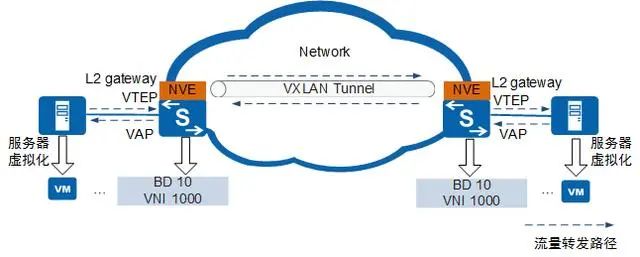 VXLAN(Virtual eXtensible Local Area Network,虚拟扩展局域网)在本质上属于一种VPN技术,能够在任意路由可达的网络上叠加二层虚拟网络,通过VXLAN网关实现VXLAN网络内部的互通,同时,也可以实现与传统的非VXLAN网络的互通。 VXLAN通过采用MAC in UDP封装来延伸二层网络,将以太报文封装在IP报文之上,通过路由在网络中传输,中间的传输网络无需关注虚拟机的MAC地址,且路由网络无网络结构限制,具备大规模扩展能力。通过路由网络,虚拟机迁移不受网络架构限制。