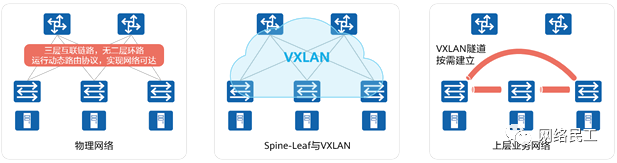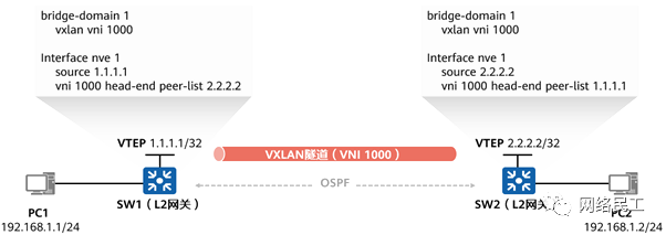 BGP EVPN将用于建立VXLAN隧道的相关信息在对等体之间通告。 设备之间建立VXLAN隧道,为后续的数据转发做准备。