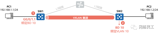 类似传统网络中采用VLAN划分广播域,在VXLAN网络中一个BD就标识一个大二层广播域。 VNI以1:1方式映射到广播域BD,同一个BD内的终端可以进行二层互通。