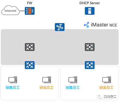 通过引入虚拟化技术,在园区网络中基于一张物理网络创建多张虚拟网络(VN,Virtual Network)。不同的虚拟网络应用于不同的业务,例如办公、研发或物联网等。 通过iMaster NCE(华为园区网络SDN控制器)实现全网设备集中管理,管理员通过图形化界面实现网络配置。 iMaster NCE将管理员的网络业务配置意图“翻译”成设备命令,通过NETCONF协议将配置下发到各台设备,实现网络的自动驾驶。