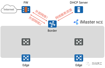 用户根据业务需求,将物理设备(核心交换机、汇聚交换机及接入交换机)添加到Fabric中。 用户指定交换机的角色:Border节点及Edge节点。 iMaster NCE自动将Border指定为RR,优化网络逻辑架构、BGP对等体关系模型。 用户预定义2个“外部网络”,用于供2个VN到达外部网络。 用户定义1个“网络服务资源”,用于后续终端通过该资源(中的DHCP Server)获取IP地址。