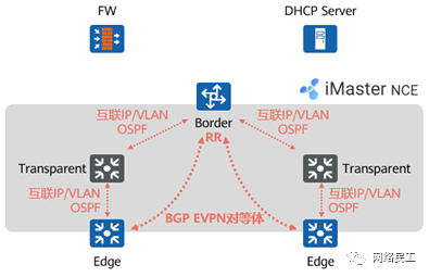 iMaster NCE根据已发现的物理网络拓扑,结合用户所定义的Fabric网络,自动进行网络编排(用户可选择OSPF多区域或单区域,是否针对OSPF报文进行认证等)。 iMaster NCE根据网络编排结果将Underlay网络配置自动下发到设备,使得设备之间IP可达。完成本步骤后,交换机便自动获得互联IP地址、VLAN配置,以及OSPF配置,交换机之间实现了路由可达。 iMaster NCE将Fabric配置自动下发到设备,设备之间建立BGP EVPN对等体关系,完成控制面的准备工作。