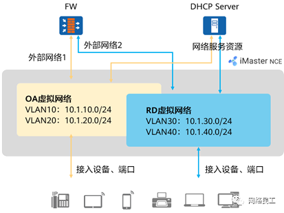 用户分别创建OA及RD虚拟网络,指定虚拟网络的IP网段/VLAN、网关地址、所关联的外部网络及网络服务资源,以及终端接入点位。 iMaster NCE将用户意图翻译成配置下发到网络设备上。