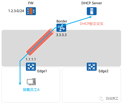 销售员工A接入网络,首先完成用户认证,认证成功后,认证点Edge1获得该用户的授权结果,将用户划分到对应VLAN。 A发起DHCP请求,该请求到达网关设备Edge1后,后者将DHCP请求进行中继,中继报文通过VXLAN隧道转发给Border。 Border将VXLAN解封装,并将DHCP中继报文转发给DHCP Server。 DHCP Server为A分配IP地址。