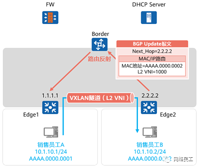销售员工A与B通过准入认证,接入园区网络。 以销售员工B为例,Edge2将其MAC地址通过BGP更新报文通告给Border,后者将其反射给Edge1。 Edge1学习到MAC地址0000.0002。 当A发送数据给B时,流量到达Edge1后,Edge1将其执行VXLAN封装,然后转发到Edge2。后者VXLAN解封装后送达目的地。