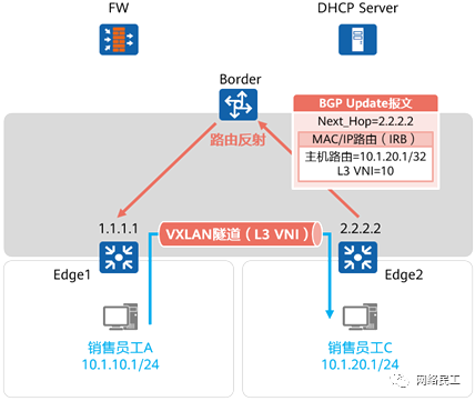 销售员工C通过准入认证,接入园区网络。 Edge2将其主机路由通过BGP更新报文通告给Border,后者将其反射给Edge1。 Edge1学习到1.20.1/32路由,路由下一跳为2.2.2.2,出接口为VXLAN隧道接口。 当A发送数据给C时,流量到达Edge1后,Edge1将其执行VXLAN封装,然后转发到Edge2。后者VXLAN解封装后送达目的地。