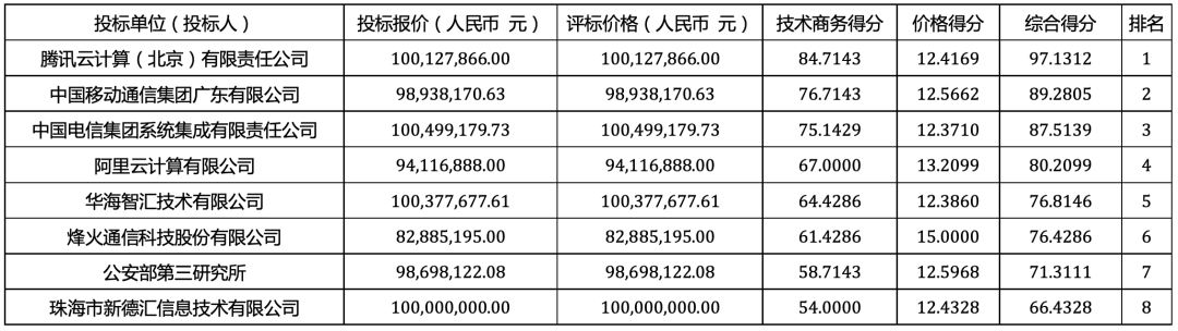 2021年9月30日,珠海市公安局(科信支队)珠海公安大数据智能化建设采购项目公开招标公告发布,预算 103398915.2 元。2021年10月22日中标(成交)结果公告发布,腾讯云计算(北京)有限责任公司 100,127,866.00 元中标。中国电信投标价格最高, 100,499,179.73 元。
