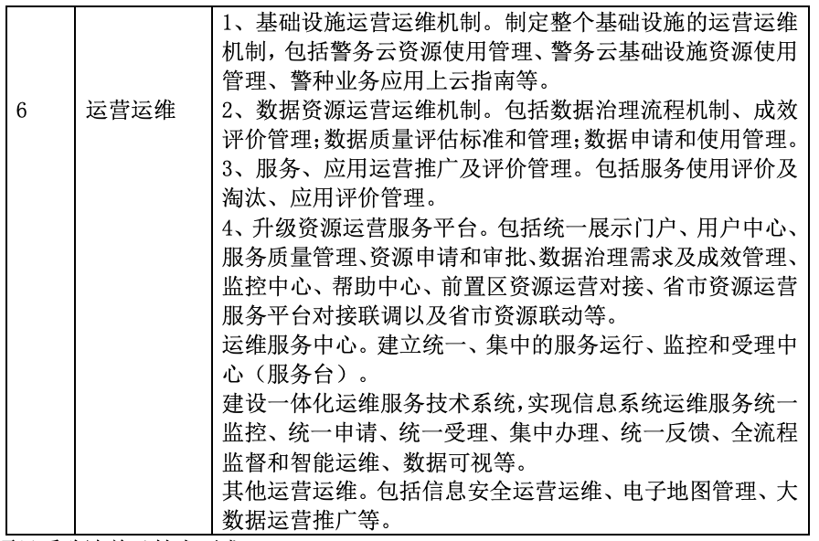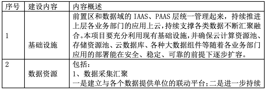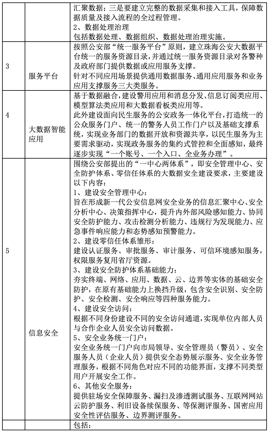 珠海市公安局历来把数据作为关键要素,重视公安数据资源体系建设工作。2015年在传统公安信息网侧建设信息资源服务平台,形成位于前置区的一套云计算、一套具有较强数据处理存储能力的大数据套件集群、一套面向应用各类服务和一批实战应用;2019年底按照公安部“六个统一”、资源“四化”新标准要求,开展新一代公安信息网、数据域侧数据中心建设,初步形成了具有数据汇聚融合,与部、省服务联动并与前置区共同形成的珠海市公安局大数据智能化基础框架。本项目旨在统筹数据采集汇聚,实现新增数据资源不少于1100种;依托数据治理工具化、智能化平台按照部规完成大数据处理,形成不少于100个资源库、主题库、知识库等数据资源体系;融合各类数据,整合信息资源服务平台和前期项目服务能力,开发不少于480项通用数据服务、通用应用服务、定制化和模型服务等,深化珠海市公安局实战应用支撑,同时继续支持珠海市公安局各单位开展“数字政府”改革创建工作;建设一套共性的、平台化查询检索、比对订阅、智能消息、模型战法和统筹全局政务服务的应用; 构筑大数据安全保障体系,提升新一代公安网安全,构建“一中心两体系”,从“云、数据、应用、网、边界、端”六维开展纵深防御体系建设,保障大数据全程可知、可管、可控、可查;建立统一运营运维体系;深入推进全局“一片云”。扩充基础设施规模,支撑日均增量不少于37亿条数据的处理和存储能力和确保落实以上其他工作任务的必要基础设施。本项目投标方应在熟悉我局前期开展的各项工作基础上理解招标方思路、目标和任务进行统筹设计,务必保护投标方已有建设投资,有效整合和优化各类资源,确保平台平滑过渡、确保向后兼容、确保合规。投标方为实现招标方的任务、需求可根据实际情况上调设备型号、提高软件性能、增加设备和许可数量,但不得降低要求。本次建设主要包括六大部分:基础设施、数据资源、服务平台、大数据智能应用、运营运维、信息安全。详见下表: