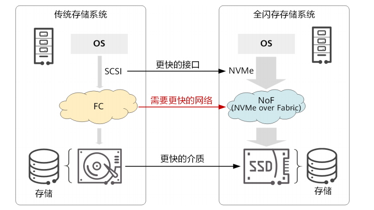 全闪存时代背景下,传统的FC(Fibre Channel,网状通道)存储网络已经无法满足全闪存数据中心的要求,NVMe(Non-Volatile Memory express,非易失性内存主机控制器接口规范)存储协议的出现极大提升了存储系统内部的存储吞吐性能、降低了传输时延,NoF(NVMe over Fabric)存储网络应运而生。