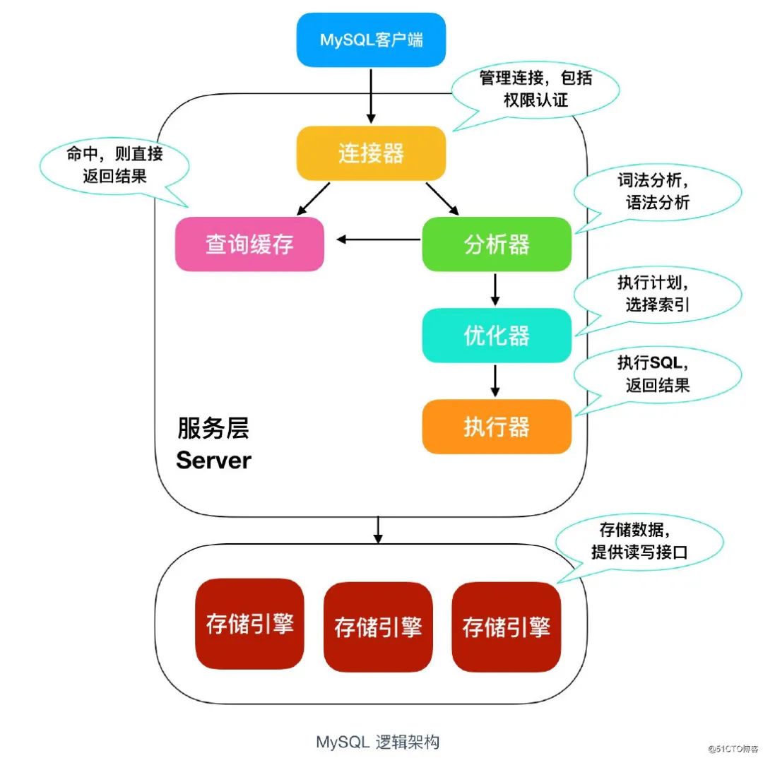 服务层:server 层包括连接器、查询缓存、分析器、优化器、执行器,包括大多数 MySQL 中的核心功能所有跨存储引擎的功能也在这一层实现,包括 存储过程、触发器、视图等。