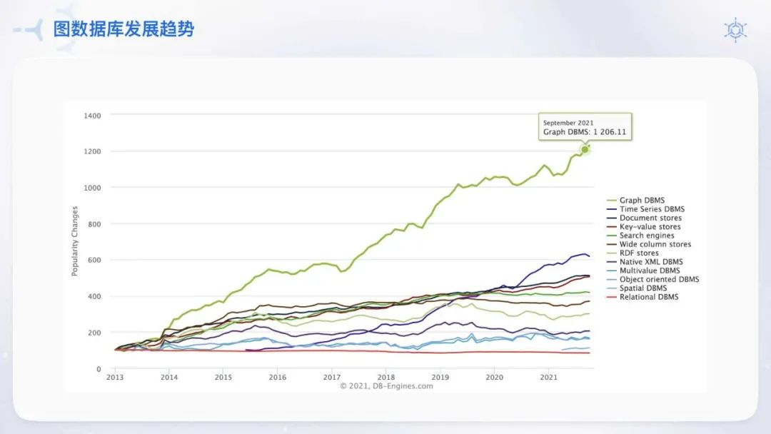 当前市场上有很多不同类型的数据库,但图数据库的受欢迎程度,是在所有数据库类型里面关注度最高的,处于一个非常迅猛的上升阶段。