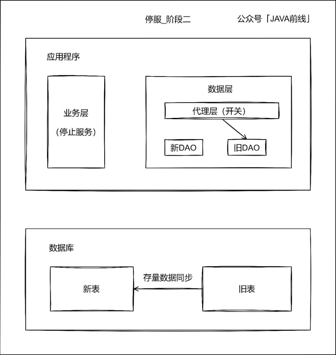 第二阶段停止服务,整个应用都没有流量,旧表数据已经处于静止状态,通过脚本将存量数据分页从旧表迁移至新表: