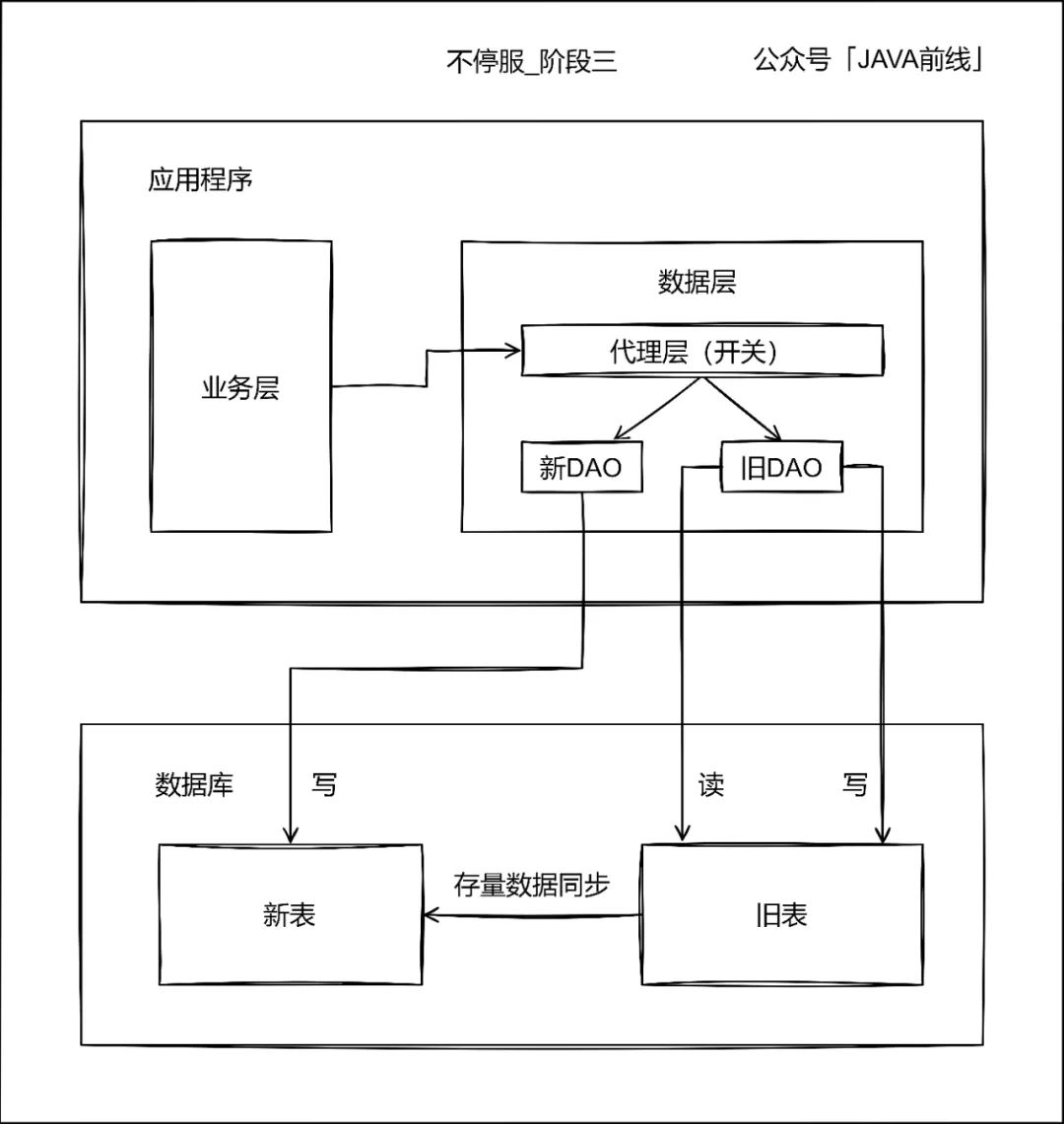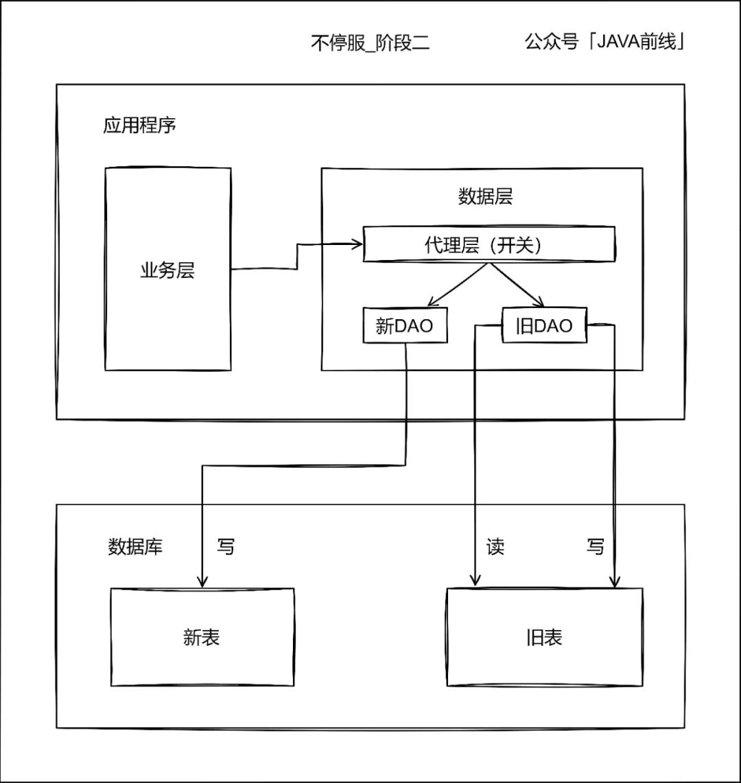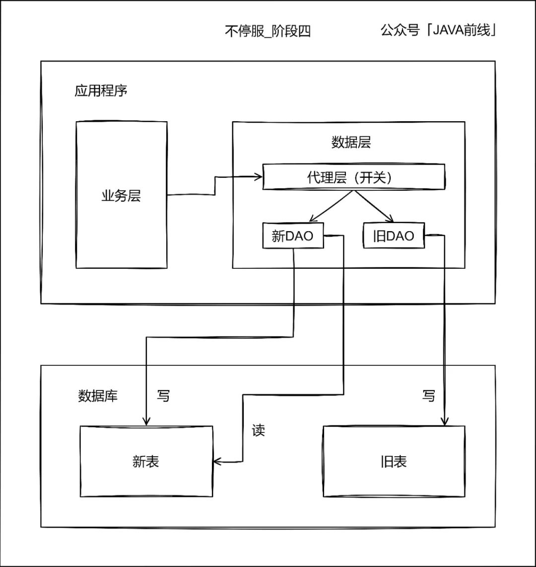 第四阶段停读旧表改读新表,此时新表已经承载了所有读写业务,但是不要立刻停写旧表,需要保持双写一段时间。
