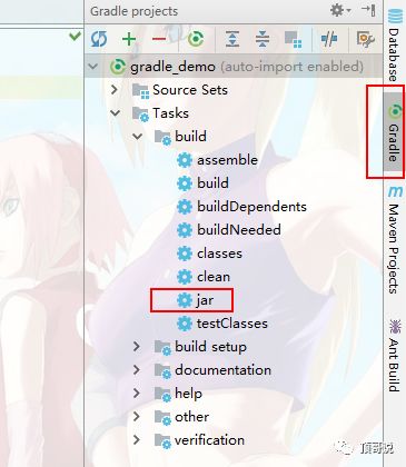 如图,我们进入到gradle的控制台,可以看到和Maven还是有些差别的。这里有一个jar, 如果我们将上一步的apply plugin : 'jar' 改为 apply plugin : 'war',那么这里会增加一个war的插件用于打包。