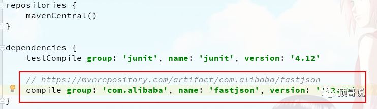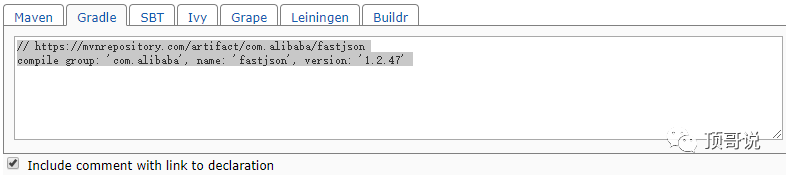 例如现在我需要fastjson的依赖,首先到Maven中央仓库复制fastJson的gradle依赖: