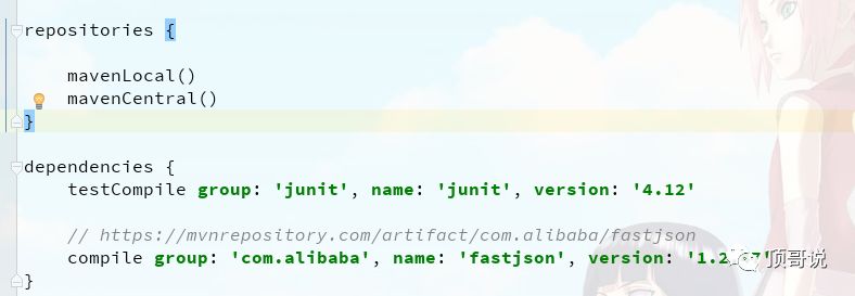 dependencies: 管理依赖,和使用Maven一样,到中央仓库找到依赖的坐标复制过来即可(gradle坐标)