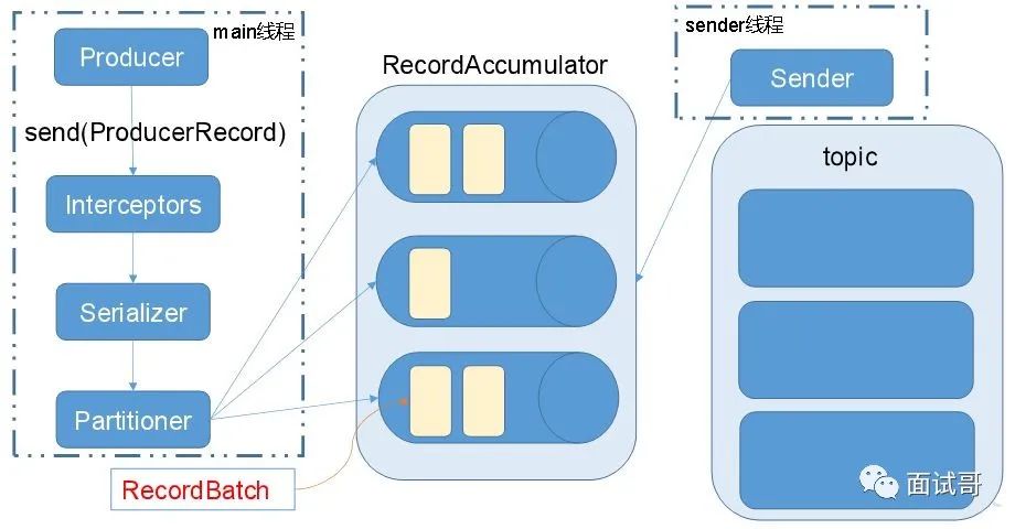 12. Kafka生产者客户端的整体结构是什么样子的?使用了几个线程来处理?分别是什么?