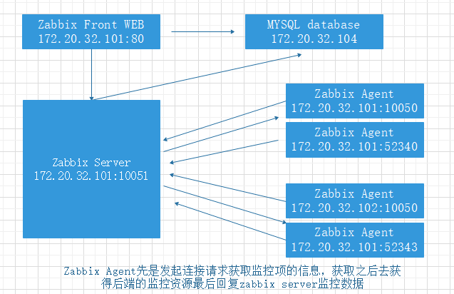 主动模式是由 zabbix agent 主动向 zabbix server 的 10051 端口发起 tcp连接请求,因此主动模式下必须在 zabbix agent 配置文件中指定 zabbix server的 IP 或者主机名(必须可以被解析为 IP 地址),在连接到 zabbix server 之前zabbix agent 是不知道自己要采集那些数据以及间隔多久采集一次数据的,然后在连接到 zabbix server 以后获取到自己的监控项和数据采集间隔周期时间,然后再根据监控项采集数据并返回给 zabbix server,在主动模式下不再需要 zabbix serve向 zabbix agent 发起连接请求,因此主动模式在一定程度上可减轻zabbix server 打开的本地随机端口和进程数,在一定程度就减轻zabbix server 的压力。