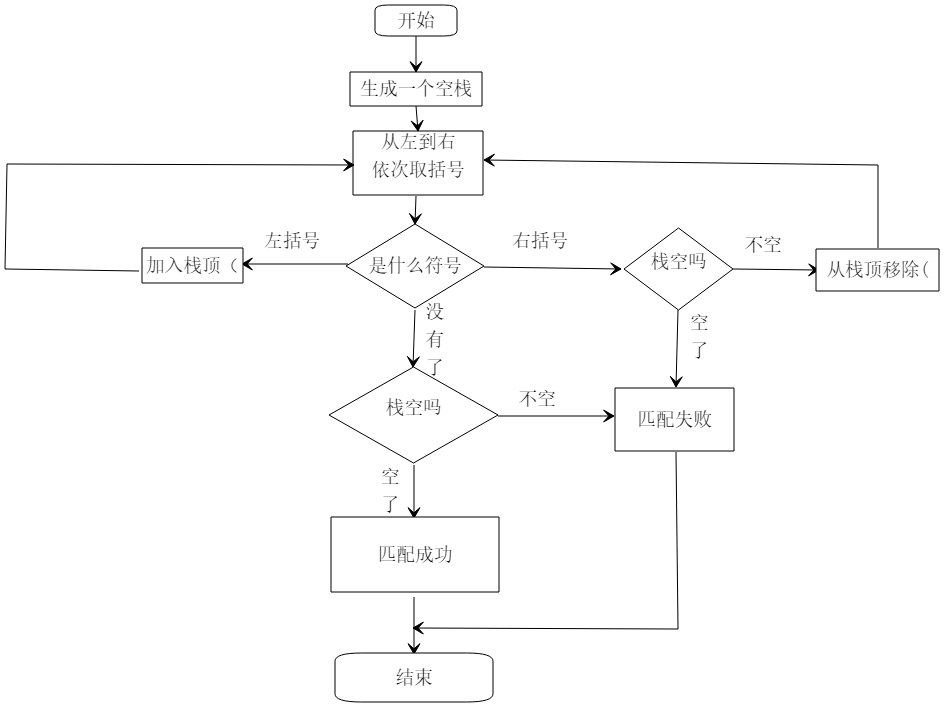 从左到右扫描括号串,最新打开的左括号,应该匹配最先遇到的右括号,第一个左括号(最早打开),就应该匹配 最后一个右括号(最后遇到)。这种次序反转的识别,正好符合栈的特性!
