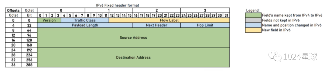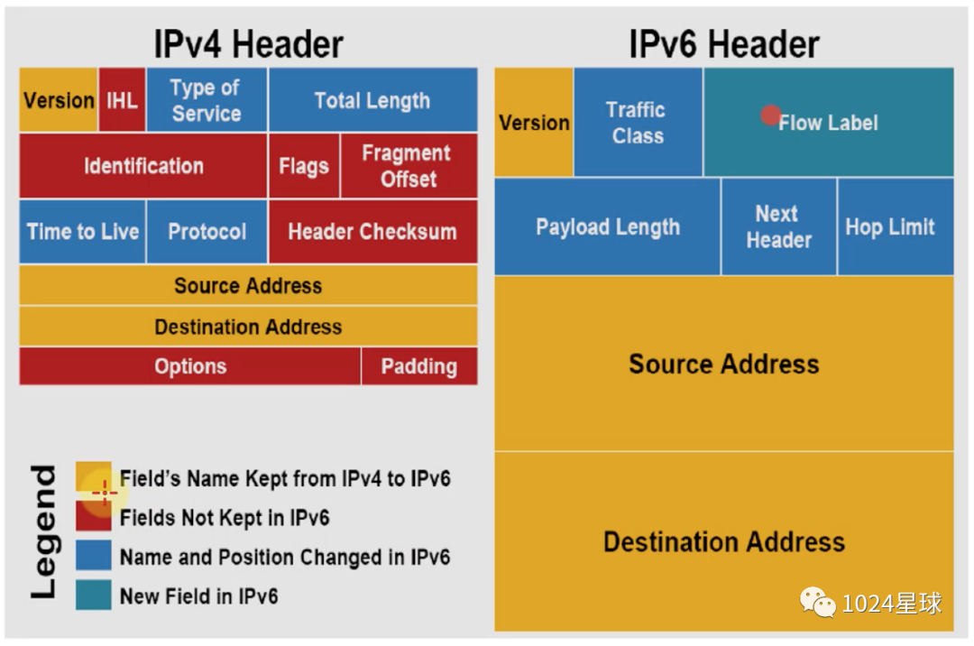 黄颜色:IPv6保留IPv4的字段 红颜色:IPv6丢弃IPv4的字段 蓝颜色:字段名字和位置发生变化 绿颜色:IPv6新的字段