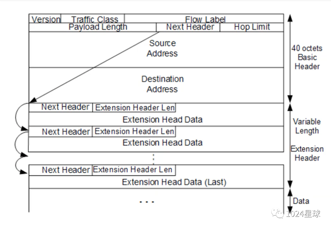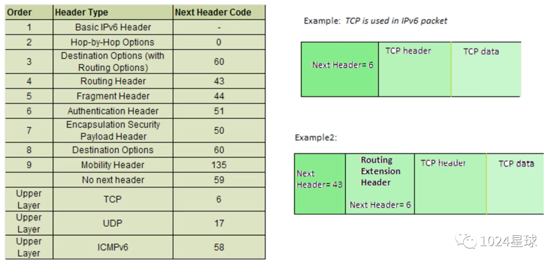 Next Header(占8bit):下一个头部,指示扩展头部(如果存在)的类型,上层数据包的协议类型(例如TCP、UDP、ICMPv6)。