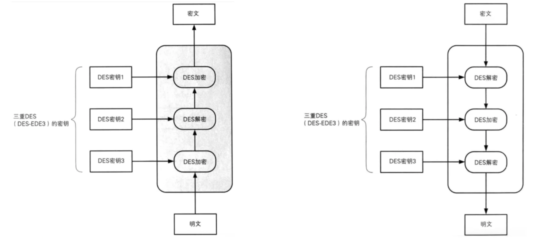 3个密钥都是不同的,也称为DES-EDE3。EDE是Encryption Decryption Encryption的缩写。