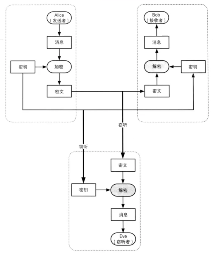 如果Alice将使用对称加密过的消息发给了Bob,只有将密钥发送给Bob,Bob才能完成解密。在发送密钥过程中,可能会被Eve窃取密钥,最后Eve也能完成解密。