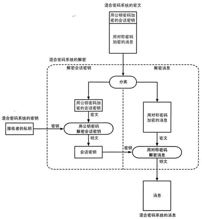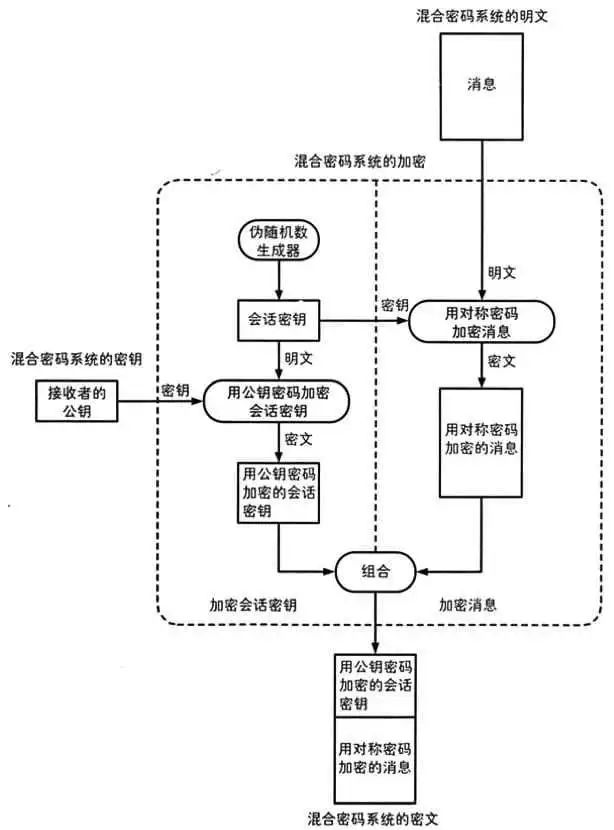 混合密码系统:是将对称加密和非对称加密的优势相结合的方法。解决了非对称加密速度慢的问题,并通过非对称加密解决了对称加密的密钥配送问题。