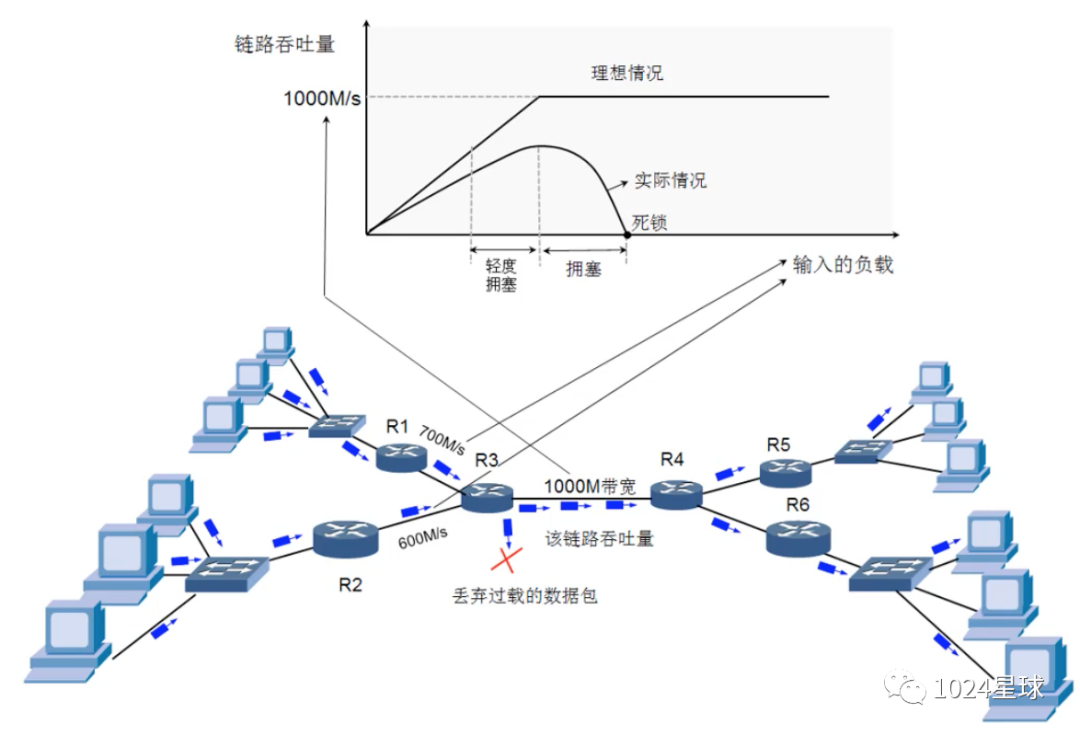 负载指的是经过路由器的带宽量总和。吞吐量就是带宽理论峰值。上图中链路吞吐量的理想情况是当负责超过带宽时,吞吐量达到峰值。但实际情况是,当负载越来越大(网络开始拥塞),吞吐量不会达到带宽值,并且之后就会下滑(网络拥塞开始严重),负载达到一定程度后网络就会卡死(死锁)。