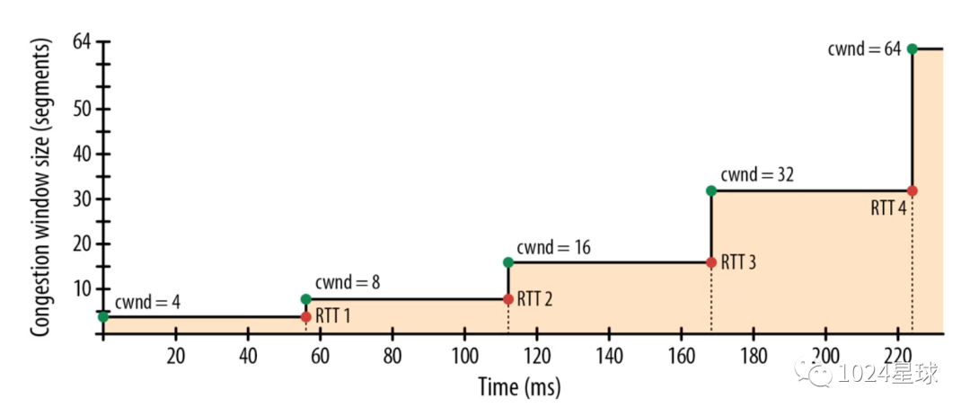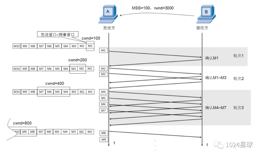 当主机开始发送数据时,如果立即所大量数据字节注入到网络,那么就有可能引起网络拥塞,因为现在并不清楚网络的负荷情况。因此,较好的方法是先探测一下,即由小到大逐渐增大发送窗口,也就是说,由小到大逐渐增大拥塞窗口数值。通常在刚刚开始发送报文段时,先把拥塞窗口CWND设置为一个最大报文段MSS的数值。而在每收到一个对新的报文段的确认后,把拥塞窗口增加至多一个MSS的数值。用这样的方法逐步增大发送方的拥塞窗口CWND,可以使分组注入到网络的速率更加合理。