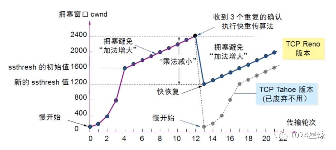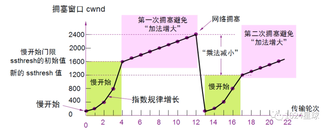 时),就改为执行拥塞控制算法,拥塞窗口按线性规律增长。假定拥塞窗口的数值增长到24时,网络出现超时(这很可能就是网络发生拥塞了)。更新后的ssthresh值变为12(即变为出现超时时的拥塞窗口数值24的一半),拥塞窗口再重新设置为1,并执行慢开始算法。当 CWND=ssthresh=12