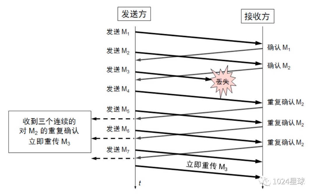 发送方: 只要连续收到三个重复确认(总共4个相同的确认),就应当立即重传对方尚未收到的报文段,而不必继续等待重传计时器到期后再重传。