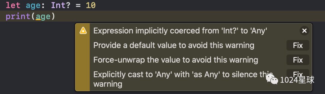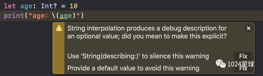 可选项在字符串插值或者直接打印时,编译器会发出警告。