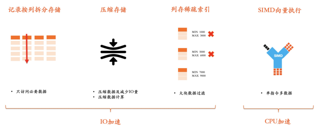 在分析场景经常需要访问某个列的大量记录,而列存按列拆分存储的方式会避免读取不需要的列。其次列存由于把相同属性的列连续保存,其压缩效率也远超行存,通常可以达到10倍以上。最后列存中大块存储的结构,结合MIN/MAX等粗糙索引信息可以实现大范围的数据过滤。所有这些行为都极大的提升了IO的效率。在现今存储计算分离的架构下,减少通过网络读取的数据量可以对查询处理的响应时间带来立竿见影的提升。 列式存储同样能提高CPU在处理数据时的执行效率,首先列存的紧凑排列方式可提升CPU访问内存效率,减少L1/L2 Cache miss导致的执行停顿。其次在列式存储上可以使用应用SIMD技术进一步提升单核吞吐能力,而这是现代高性能分析执行引擎的通用技术路线(Oracle/SQL Server/ClickHouse).