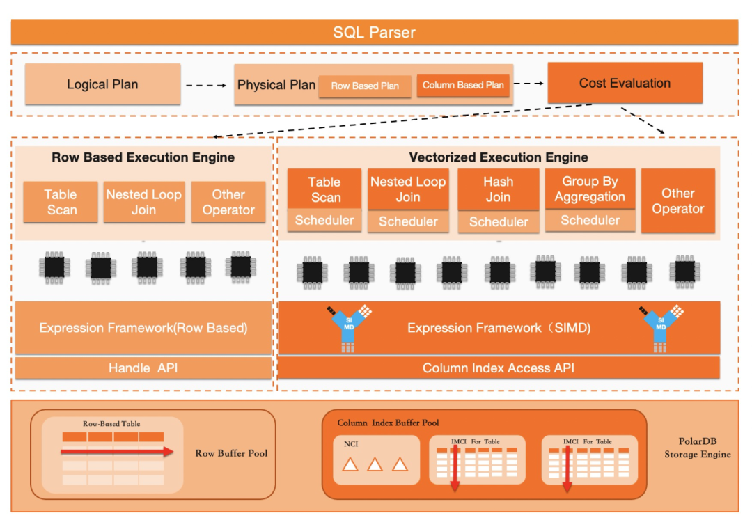在PolarDB的存储引擎(InnoDB)上新增对列式索引(Columnar Index)的支持,用户可以选择通过DDL将一张表的全部列或者部分列创建为列索引,列索引采用列压缩存储,其存储空间消耗会远小于行存格式。默认列索引会全部常驻内存以实现最大化分析性能,但是当内存不够时也支持将其持久化到共享存储上。 在PolarDB的SQL执行器层,我们重写了一套面向列存的执行器引擎框架(Column-oriented), 该执行器框架充分利用列式存储的优势,如以4096行的一个Batch为单位访问存储层的数据,使用SIMD指令提升CPU单核心处理数据的吞吐,所有关键算子均支持并行执行。在列式存储上,新的执行器对比MySQL原有的行存执行器性有几个数量级的性能提升。 支持行列混合执行的优化器框架,该优化器框架会根据下发的SQL是否能在列索引上执行覆盖查询,并且其所依赖的的函数及算子能被列式执行器所支持来决定是否启动列式执行。优化器会同时对行存执行计划和列存执行计划做代价估算,并选中代价交代的执行计划。 用户可以使用PolarDB集群中的一个RO节点作为分析型节点,在该RO节点上配置生成列存索引,复杂查询运行在列存索引上并使用所有可用CPU的计算能力,在获得最大执行性能的同时不影响该集群上的TP型负载的可用内存和CPU资源。