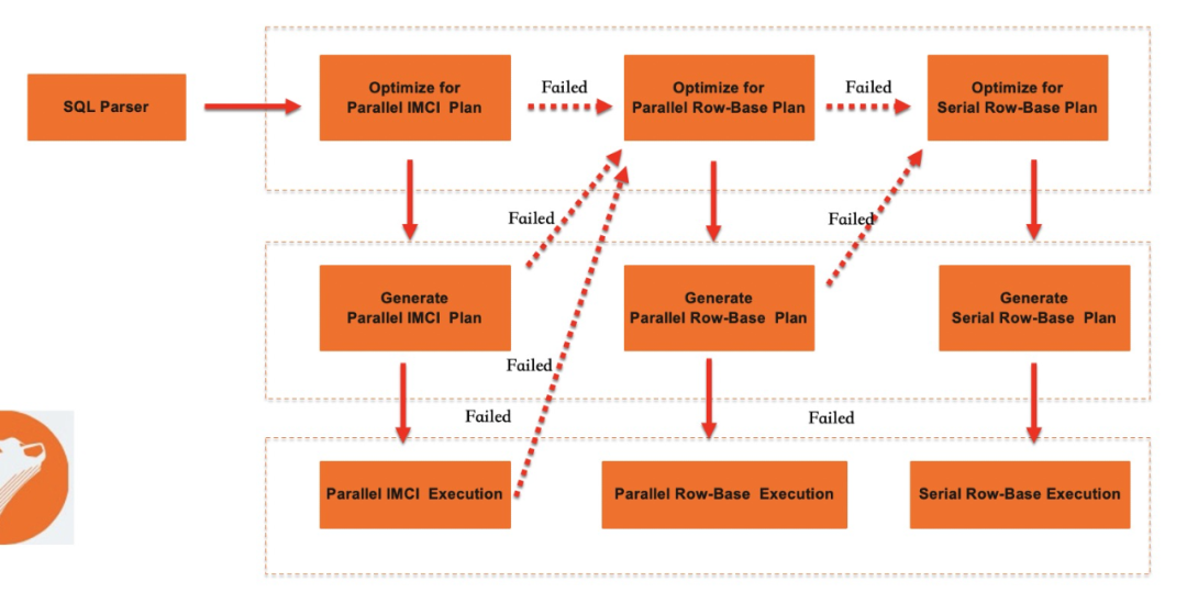 1.执行SQL的Parse过程并生成LogicalPlan,然后调用MySQL原生优化器按照执行一定优化操作,如join order调整等。同时该阶段获得的逻辑执行计划会转给IMCI的执行计划编译模块,尝试生成一个列存的执行计划(此处可能会被白名单拦截并fallback回行存)。