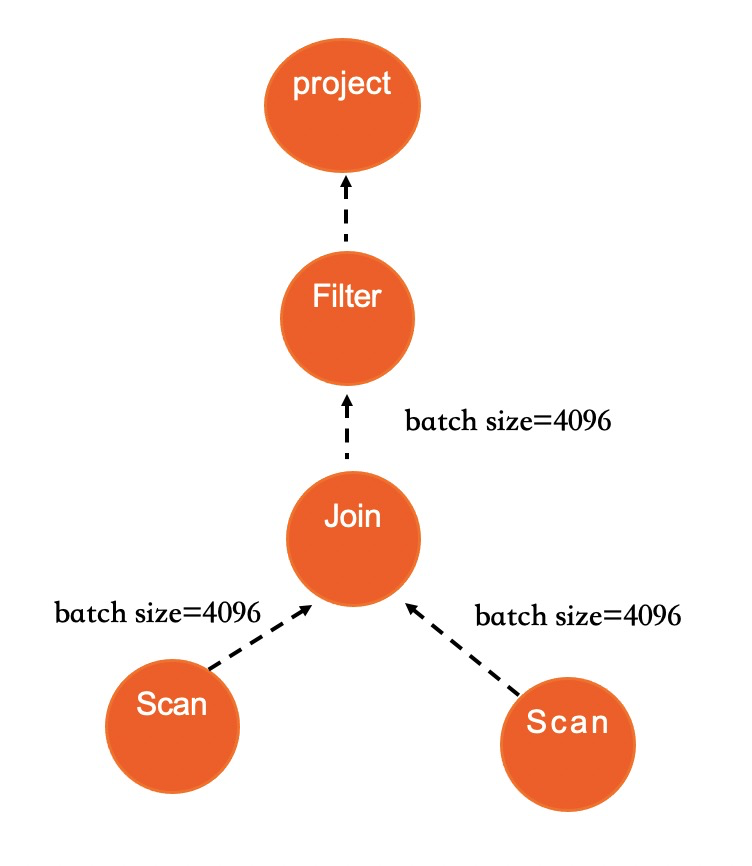 在IMCI的执行引擎中,每个Operator也使用迭代器函数来访问数据,但不同的是每次调用迭代器会返回一批的数据,而不是一行,可以认为这是一个支持batch处理的火山模型。