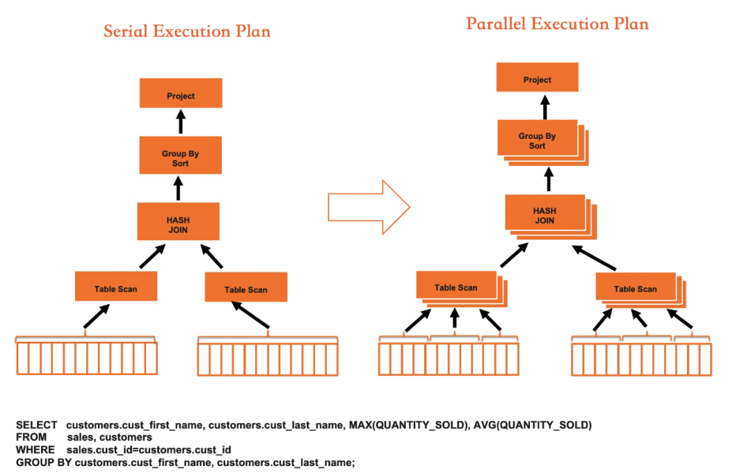 串行执行受制于单核计算效率,访存延时,IO延迟等限制,执行能力有限。而IMCI执行器在几个关键物理算子(Scan/Join/Agg等)上均支持并行执行。除物理算子需要支持并行外,IMCI的优化器需要支持生成并行执行计划,优化器在确定一个表的访问方式时,会根据需要访问的数据量来决定是否启用并行执行,如果确定启用并行执行,则会参考一系列状态数据决定并行度:包括当前系统可用的CPU/Memory/IO资源, 目前已经调度和在排队的任务信息, 统计信息, query 的复杂程度, 用户可配置的参数等。根据这些数据计算出一个推荐的DOP值给算子, 而一个算子内部会使用相同的DOP。同时DOP也支持用户使用Hint的方式进行设定。