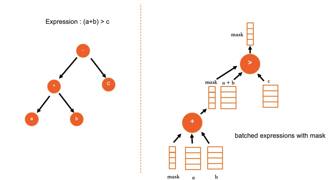 采用了与Postgres类似表达式实现方法:在SQL编译及优化阶段,IMCI的表达式以一个树形结构来存储(与现有行式迭代器模型的表现方法类似),但是在执行之前会对该表达式树进行一个后序遍历,将其转换为一维数组来存储,在后续计算时只需要遍历该一维数组结构即可以完成运算。由于消除了树形迭代器模型中的递归过程,计算效率更高。同时该方法对计算过程提供简洁的抽象,将数据和计算过程分离,天然适合并行计算。