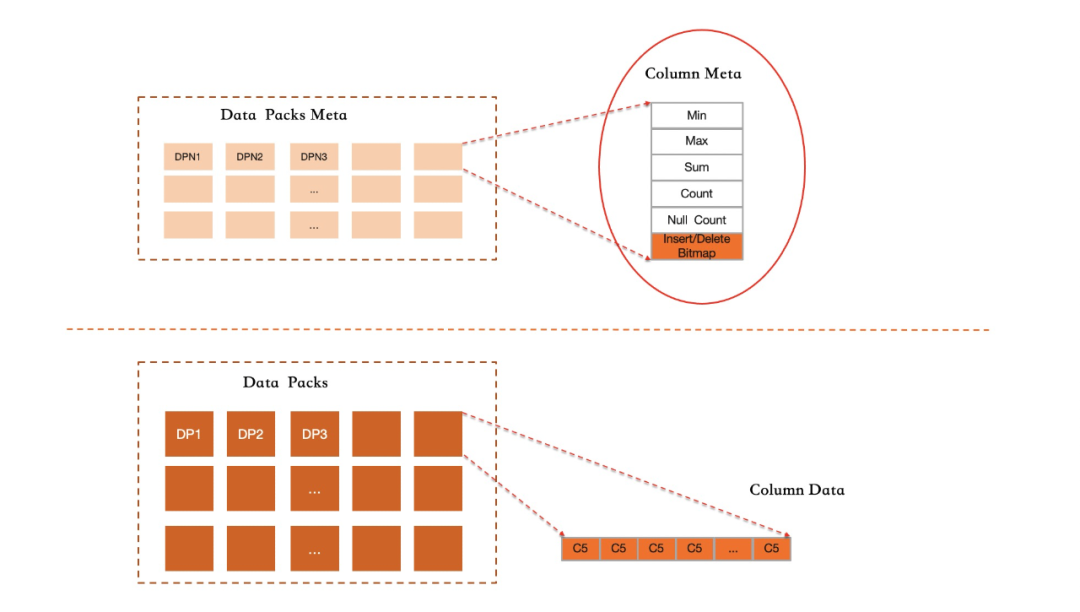 每个RowGroup都采用追加写,分属每个列的DataPack也是采用追加写模式。对于一个列索引,只有个Active RowGroup负责接受新的写入。当该RowGroup写满之后即冻结,其包含的所有Datapack会转为压缩格保存到磁盘上,同时记录每个数据块的统计信息便于过滤。