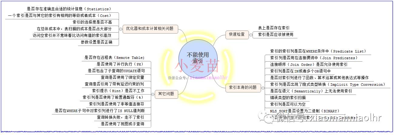 “为什么索引没有被使用”是一个涉及面较广的问题。有多种原因会导致索引不能被使用。首要的原因就是统计信息不准,第二原因就是索引的选择度不高,使用索引比使用全表扫描效率更差。还有一个比较常见的原因,就是对索引列进行了函数、算术运算或其他表达式等操作,或出现隐式类型转换,导致无法使用索引。还有很多其它原因会导致不能使用索引,这个问题在MOS(MOS即My Oracle Support)“文档1549181.1为何在查询中索引未被使用”中有非常详细的解释,作者已经将相关内容发布到BLOG(http://blog.itpub.net/26736162/viewspace-2113670/)上了。下面是一些非常有用的检查项目。