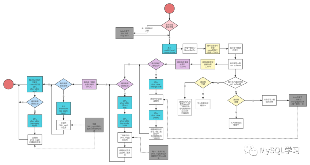 data目录下的#sql-ib**文件这个要看是否重建主键 tmp目录下的DML log临时文件,如果不重建主键,则每个二级索引都有一个。当然如果DML log很小,小于innodb_sort_buffer_size大小则不需要。 tmp目录下的merge sort临时文件,这是需要重建的每个二级索引都需要的。当然如果表数据量很小,小于innodb_sort_buffer_size大小则不需要。