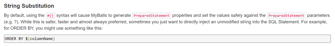 默认情况下,使用#{}格式的语法会导致MyBatis创建预处理语句属性并以他为背景设置安全的值(例如?)。这样做很安全,很迅速,是首选做法,有时只是想直接在SQL语句中插入一个不改变的字符串。例如ORDER BY,可以这样来使用ORDER BY ${columnName},这里MyBatis不会修改或转义字符串。