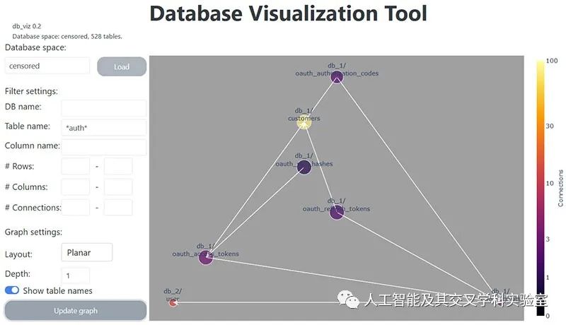 上图显示了在搜索名称中带有字符串“auth”的所有表并将深度设置为 1(包括连接到搜索结果表的表)后的 Web 应用程序。请注意,出于数据保护的原因,我在这里更改了一些名称。