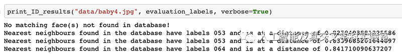 作为快速检查,让我们看看当我们输入婴儿的脸作为探测图像时系统的响应。正如预期的那样,它显示没有找到匹配的面孔!但是,我们设置 verbose