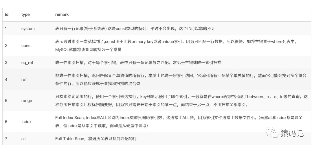 从最好到最差依次是:system >const >eq_ref >ref >range >index >ALL。一般来说,得保证查询至少达到range级别,最好能达到ref。