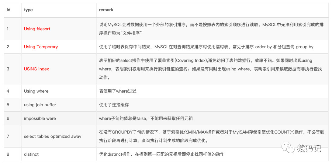 MySQL提供了一个explain命令,这个命令可以查看一个SQL语句的执行计划、有没有使用上了索引、有没有做全表扫描、以及查询的类型等。
