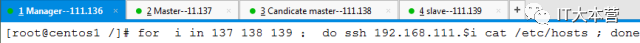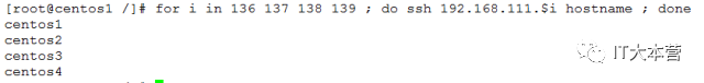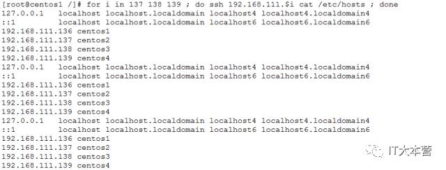 [root@centos3 /]#for i in 136 137 138 139 ; do ssh-copy-id -i ~/.ssh/id_rsa.pub root@192.168.111.$i ; done