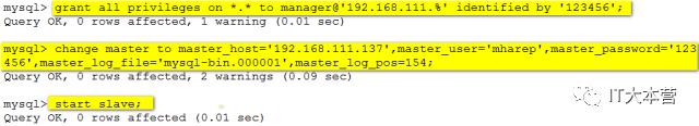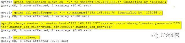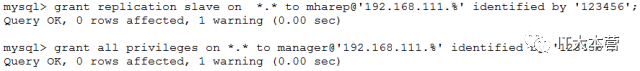 第一条grant命令是创建一个用于主从复制的帐号,在master和candicate master的主机上创建即可。